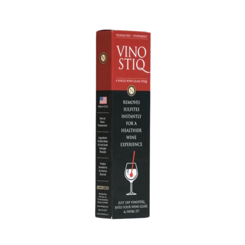 Disclaimer:VINOSTIQ is designed to remove sulfites from wine (red, white, rosé, and sparkling) to reduce the intake of these preservatives and potentially mitigate negative side effects associated with sulfite sensitivity. Each VINOSTIQ stick is for single-use in a single glass (approximately 6-8 oz) of wine. VINOSTIQ is made with 100% FDA-permitted food-grade ingredients. The active components are contained within a specially treated wooden stir stick. Some sources mention it being BPA-free and 100% recyclable. Dip the VINOSTIQ stick into your glass of wine and swirl gently for approximately 20-30 seconds or as directed on the packaging. Remove the stick and enjoy your wine. VINOSTIQ is intended to reduce sulfite levels in wine. The effectiveness of sulfite removal may vary depending on the initial sulfite content of the wine. VINOSTIQ is not intended to treat or cure any health problem or disease. If you have a diagnosed sulfite allergy or severe sensitivity, this product may not eliminate sulfites entirely, and you should still exercise caution and consult with your healthcare professional. While VINOSTIQ aims to reduce negative reactions to sulfites, individual sensitivities can vary. The manufacturer makes no guarantee that all individuals will experience the same results or complete elimination of all side effects. Each VINOSTIQ stick is designed for single use only. Do not attempt to reuse a stick. Store in a cool, dry place. Keep out of reach of children.